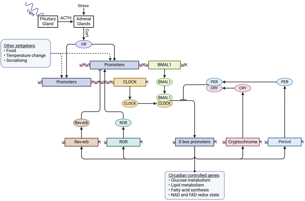 This section gets a little confusing, so I’ve included a graphic to follow as you read the text. Glucocorticoids activate the first half of a negative feedback loop in gene translation. Two genes called Circadian Locomoter Output Cycles Kaput (which someone really wanted to spell CLOCK) and Brain and Muscle ARNT-Like 1 (BMAL1) are transcribed and translated into transcription factors of the same names. CLOCK and BMAL1 transcription factors join to form a CLOCK-BMAL1 complex, which can bind to specialised gene promoters called E-boxes. E-box activation modulates a range of metabolic processes, changing how cells produce energy, and how they synthesise and degrade molecules like amino acids, nucleotides and nucleosides. Most notably for our circadian rhythm, E-boxes activate two other transcription factors: Period (PER) and Cryptochrome (CRY) which form a complex that physically cleaves CLOCK-BMAL1 from the DNA, reversing the activity caused by E-box promoters and signaling the end of the active phase. An additional feedback loop occurs through Rev-Erb and RAR-related orphan receptor (ROR) which competitively inhibit and enhance BMAL1 respectively. These proteins are expressed differently between biological tissues, giving tissue-specific enhancements to cyclic BMAL1 expression.